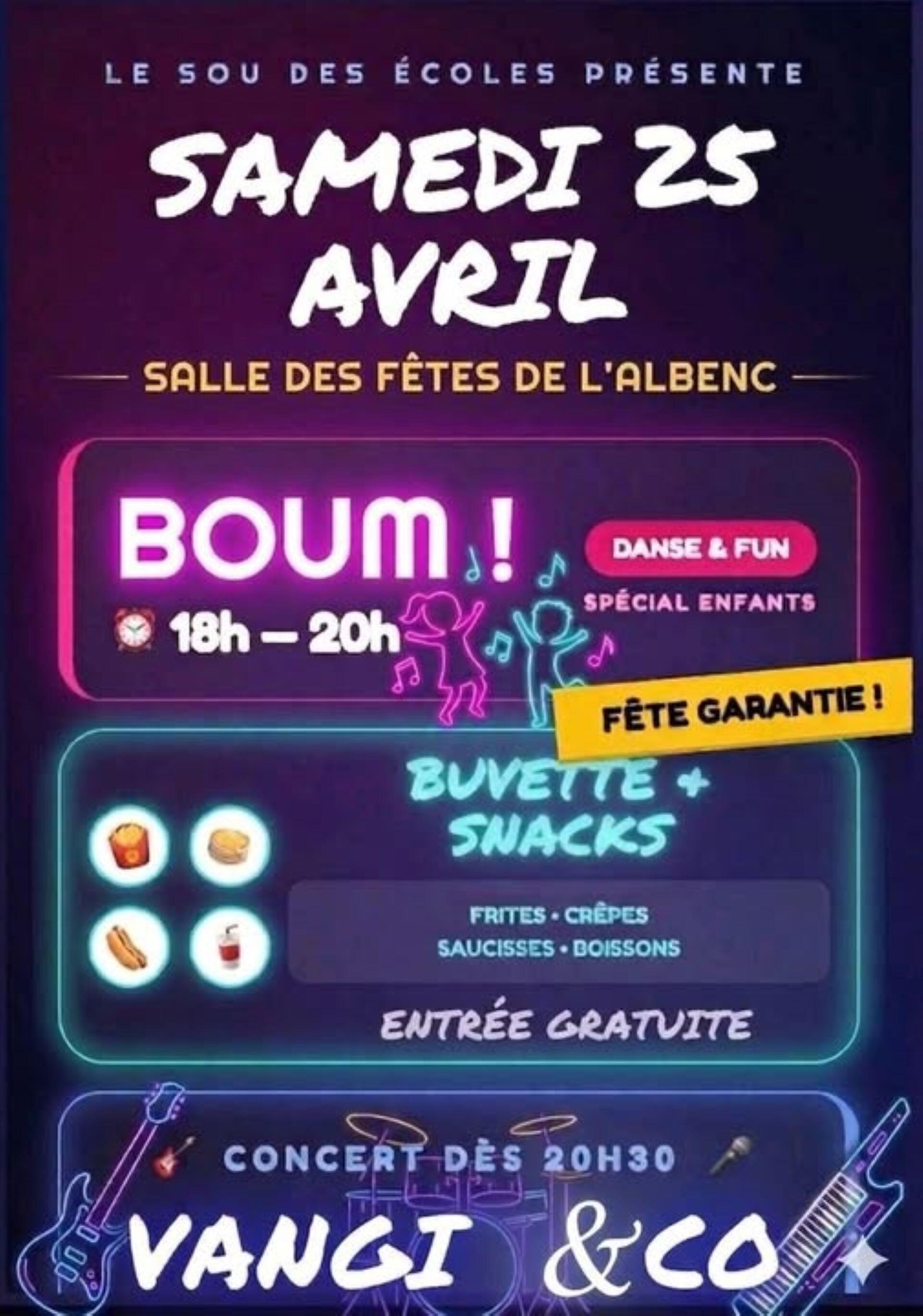 Boum spéciale enfants avec danse et fun de 18h à 20h, suivie d'un concert de Vangi & Co dès 20h30. Buvette et snacks disponibles sur place (frites, crêpes, saucisses et boissons)